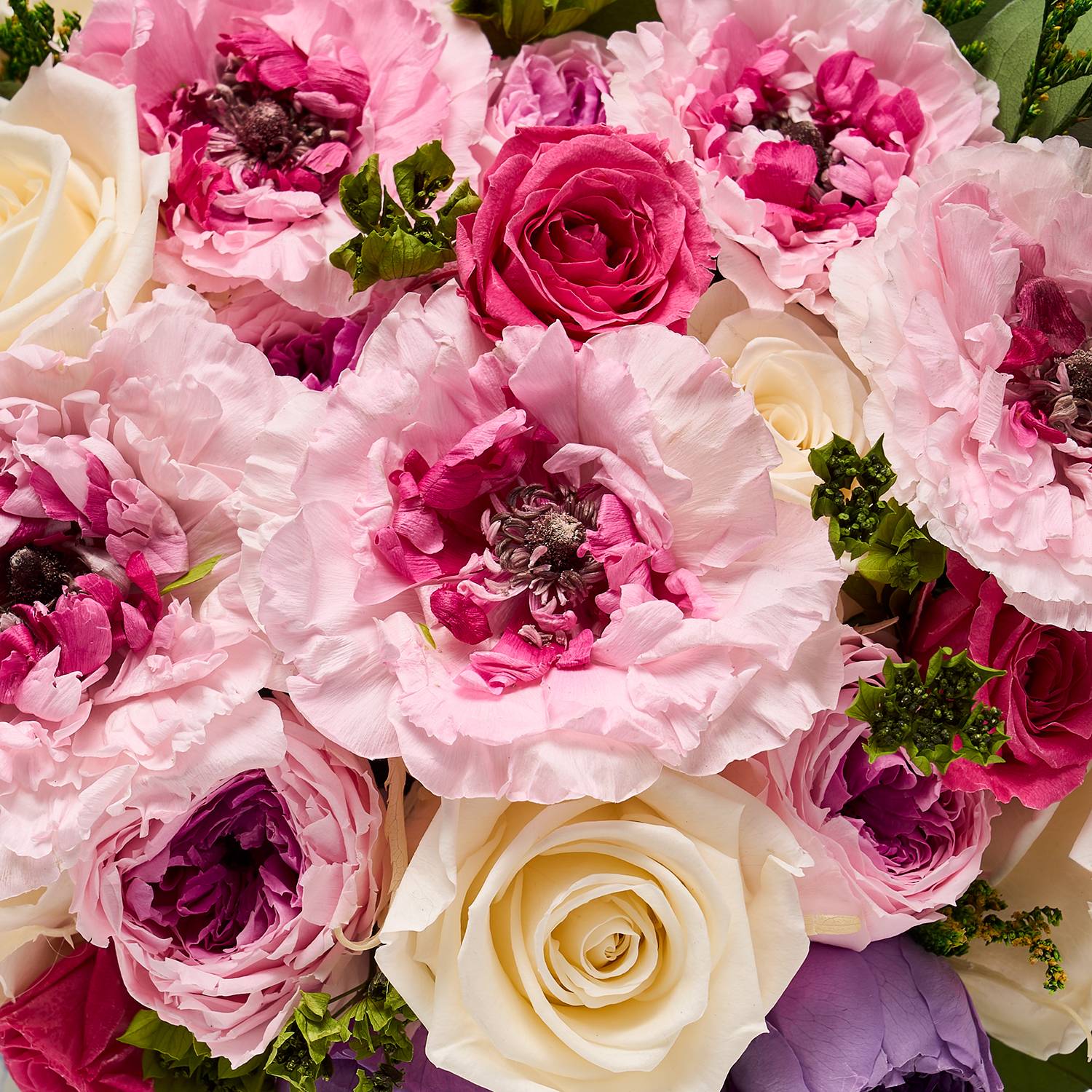 Each arrangement pairs the Eternity® Japanese Ranunculus with a refined selection of Eternity® Blooms — pearl Eternity® Roses, lavender and purple-pink Eternity® Garden Roses, raspberry Eternity® Spray Roses, and white Eternity® Hydrangeas, layered with ruscus leaves and caspia sprigs for softness, movement, and depth. Every bloom is hand-picked by botanical experts at our partner farms in Ecuador and Japan and preserved at peak beauty to enchant for a year.