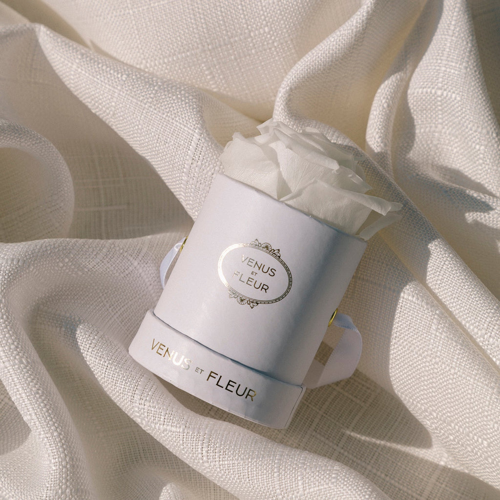 Pink rose in a white round box labeled 'VENUS ET FLEUR'