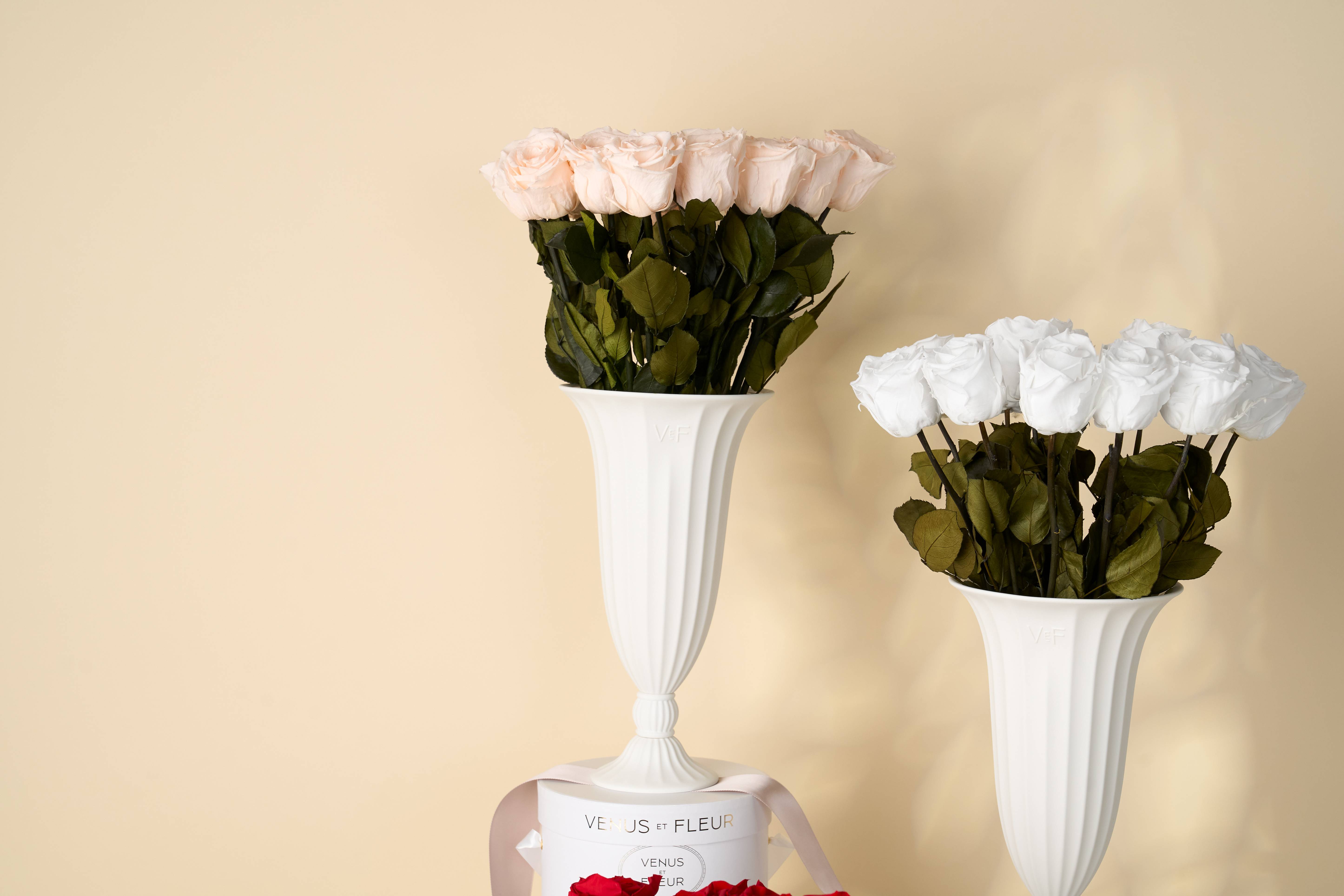 Our enchanting long-stem Eternity® Roses bring beauty and elegance into any room in your home or office. Each luxury rose arrangement comes with a handcrafted, gorgeous vase and is presented in a beautiful, experiential gift box. Featuring roses of different lengths based on the aesthetic of the arrangement, our Eternity® Roses will last an entire year and require no water or maintenance. Perfect for special occasions or to add a touch of sophistication to your décor, these long-stem roses are sure to make a lasting impression. Explore our selection, including the Aphrodite Porcelain Vase and the elegant Natural Glass Vase, and find the perfect arrangement to suit your style.