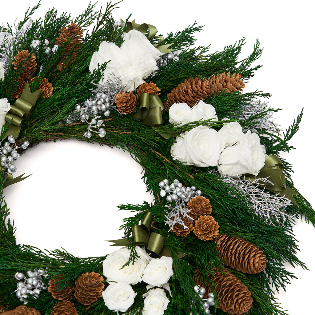 A lush foundation of juniper, cypress, and seasonal evergreens forms the base around 10 Eternity® Super Roses and 15 Eternity® Petit Roses, each bloom arranged with intention to evoke the beauty of a night sky in full bloom. Touches of winter botanicals and metallic accents shimmer softly, creating a radiant play of depth and reflection — a modern expression of holiday opulence inspired by the stars.