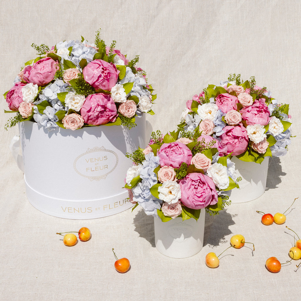 A symphony of craftsmanship that highlights the extravagance of the Eternity® Peony, exclusively grown for Venus et Fleur. This long-lasting arrangement combines our Eternity® Peonies, each one hand-selected in peak bloom and meticulously harvested by botanical experts at our partner farms in Japan, elegantly cradled alongside our signature Eternity Roses and Hydrangeas.