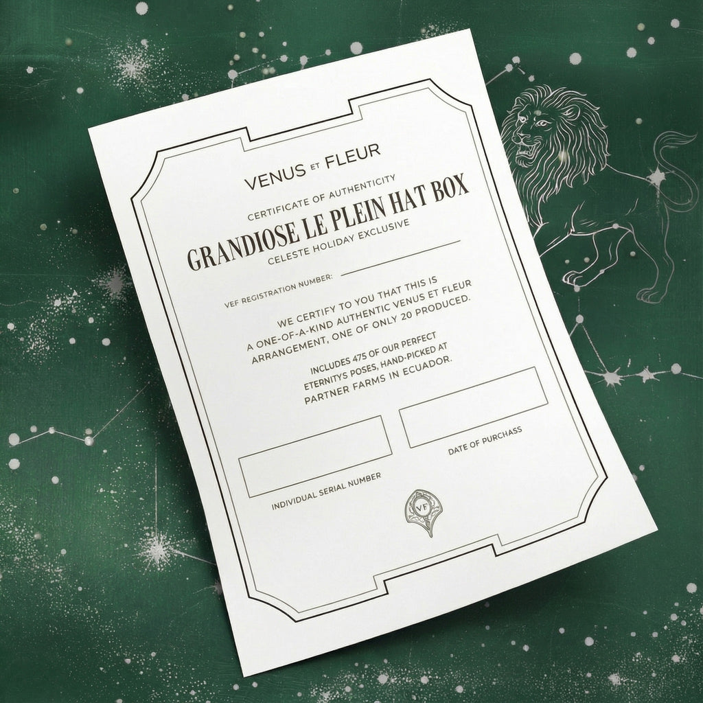 Only 25 Grandiose Le Plein arrangements have been created for the holiday season. Each arrives with a unique Celestial Certificate, individually numbered and signed by our Master Floral Artist, marking it as a true collector’s piece.