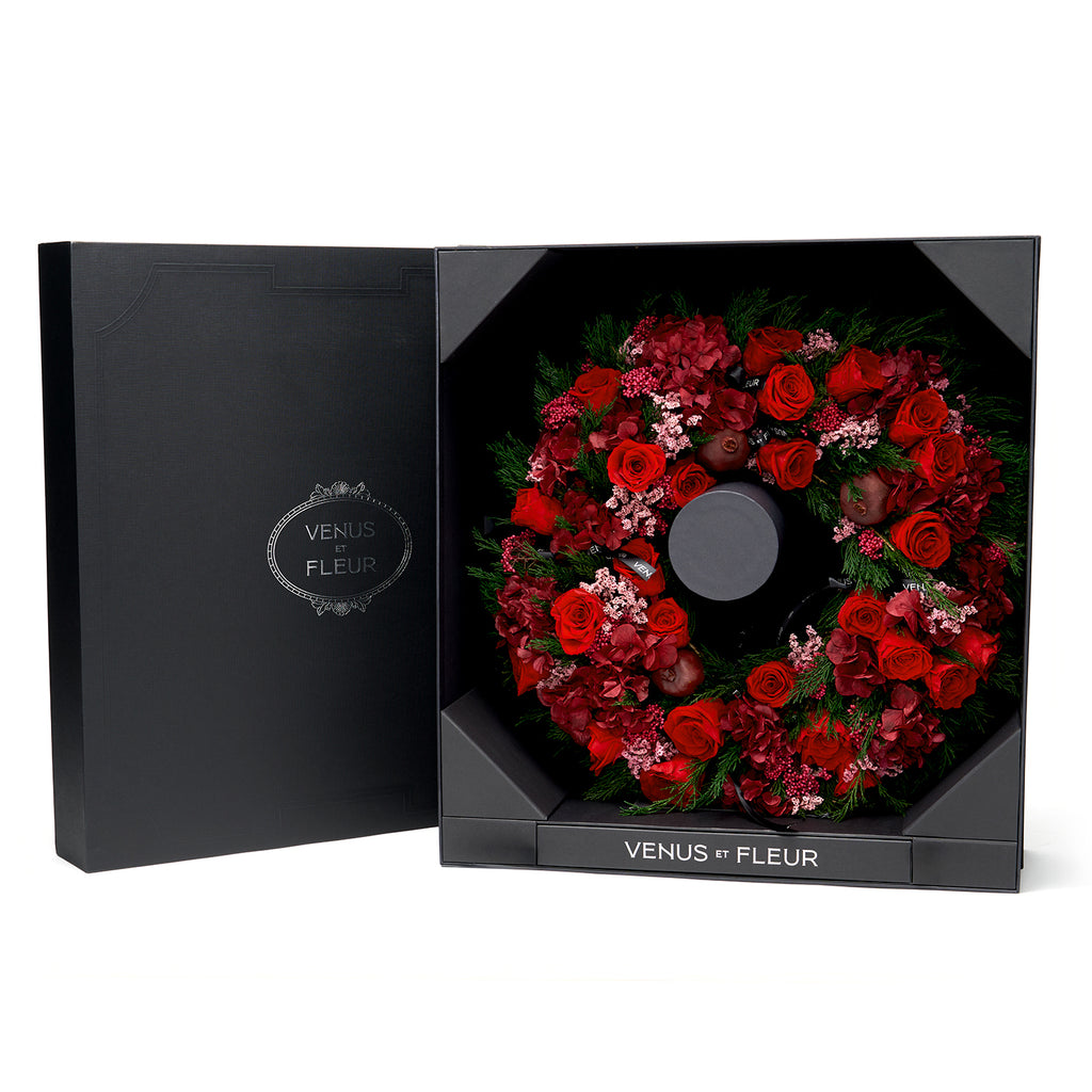 Make a striking seasonal statement with our most luxurious holiday wreath. The L-™Ã‰toile Rouge Grand Wreath is artfully handcrafted with 24 of our signature Eternity® Roses and our Eternity® Hydrangeas, arranged within a lush base of cypress, juniper, and evergreen.