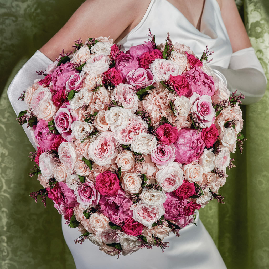 The arrangement is complemented by a refined selection of Eternity® Blooms, including white and magenta Eternity® Roses, white-to-pink Eternity® Garden Roses, peach and pink Eternity® Spray Roses, and Eternity® Majolica Roses, introduced here for the first time, layered with caspia sprigs and ruscus leaves for softness and movement. Each bloom is hand-picked by botanical experts at our partner farms and preserved at peak beauty, creating a timeless keepsake designed to last a year.