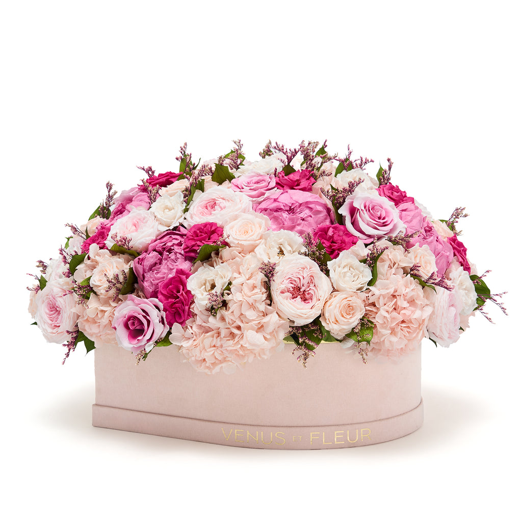 Set within our signature suede heart-shaped box, detailed with the Venus et Fleur logo and rendered in romantic tones, this opulent arrangement is designed to be displayed and cherished. A timeless keepsake and a visual representation of a love letter, Peony d’Amour Le Plein Heart is a striking expression of love, perfect for brightening any space and every day of the year.