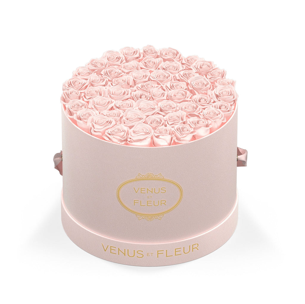 Round pink box filled with white roses, with 'VENUS ET FLEUR' written in gold on the box