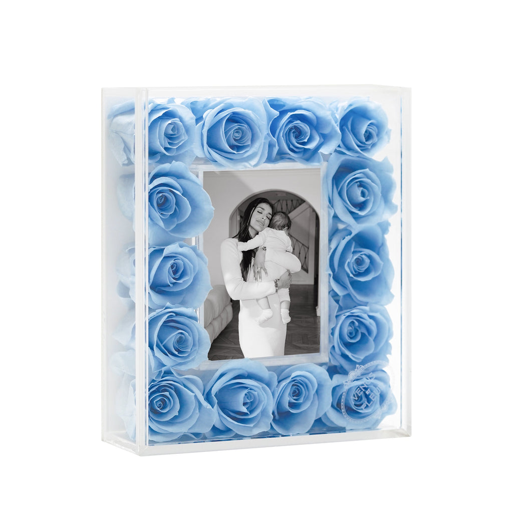The exquisite Fleur Frame, adorned with 14 stunning eternity roses, measures 4.64" x 5.64" in size. It gracefully accommodates a 2" x 3" photo within its elegant display area.
