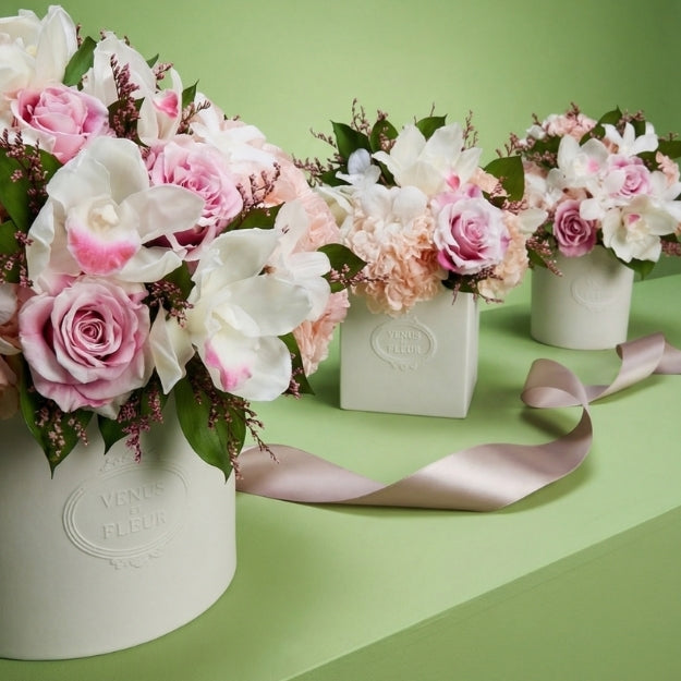 Exclusively crafted for the season and nestled in our signature porcelain Fleura Vase, Orchid Magnifique is a sculptural composition that highlights the elegance of our Eternity® Orchids. This arrangement introduces our Eternity® Cymbidium Orchids, a new floral innovation exclusively grown for Venus et Fleur in Japan, and prized for their architectural form.