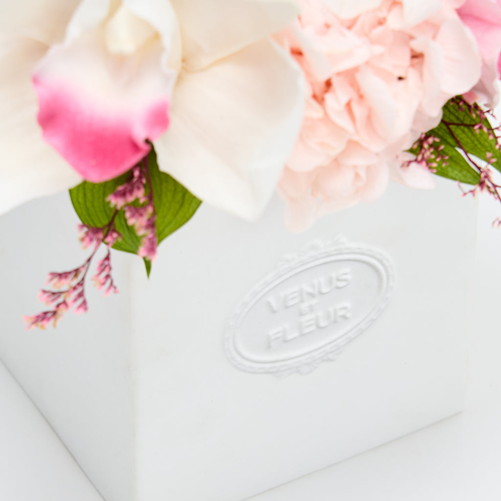 The composition brings together white and pink Eternity® Cymbidium Orchids, white Eternity® Dendrobium Orchids, blush Eternity® Hydrangeas, and white and magenta Eternity® Roses, accented with purple caspia sprigs and green ruscus leaves for depth and movement. Each Eternity® Bloom is hand-picked by botanical experts at our partner farms in Japan and Ecuador, then preserved at peak beauty to enchant for a year.