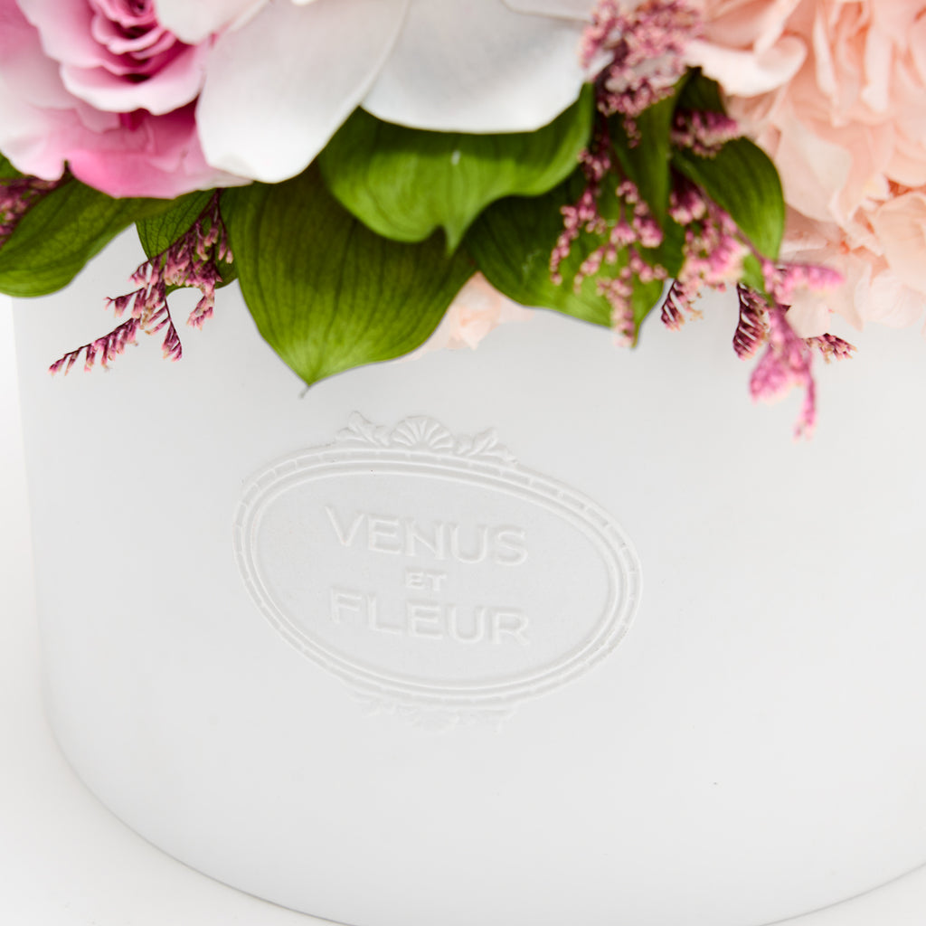 The composition brings together white and pink Eternity® Cymbidium Orchids, white Eternity® Dendrobium Orchids, blush Eternity® Hydrangeas, and white and magenta Eternity® Roses, accented with purple caspia sprigs and green ruscus leaves for depth and movement. Each Eternity® Bloom is hand-picked by botanical experts at our partner farms in Japan and Ecuador, then preserved at peak beauty to enchant for a year.