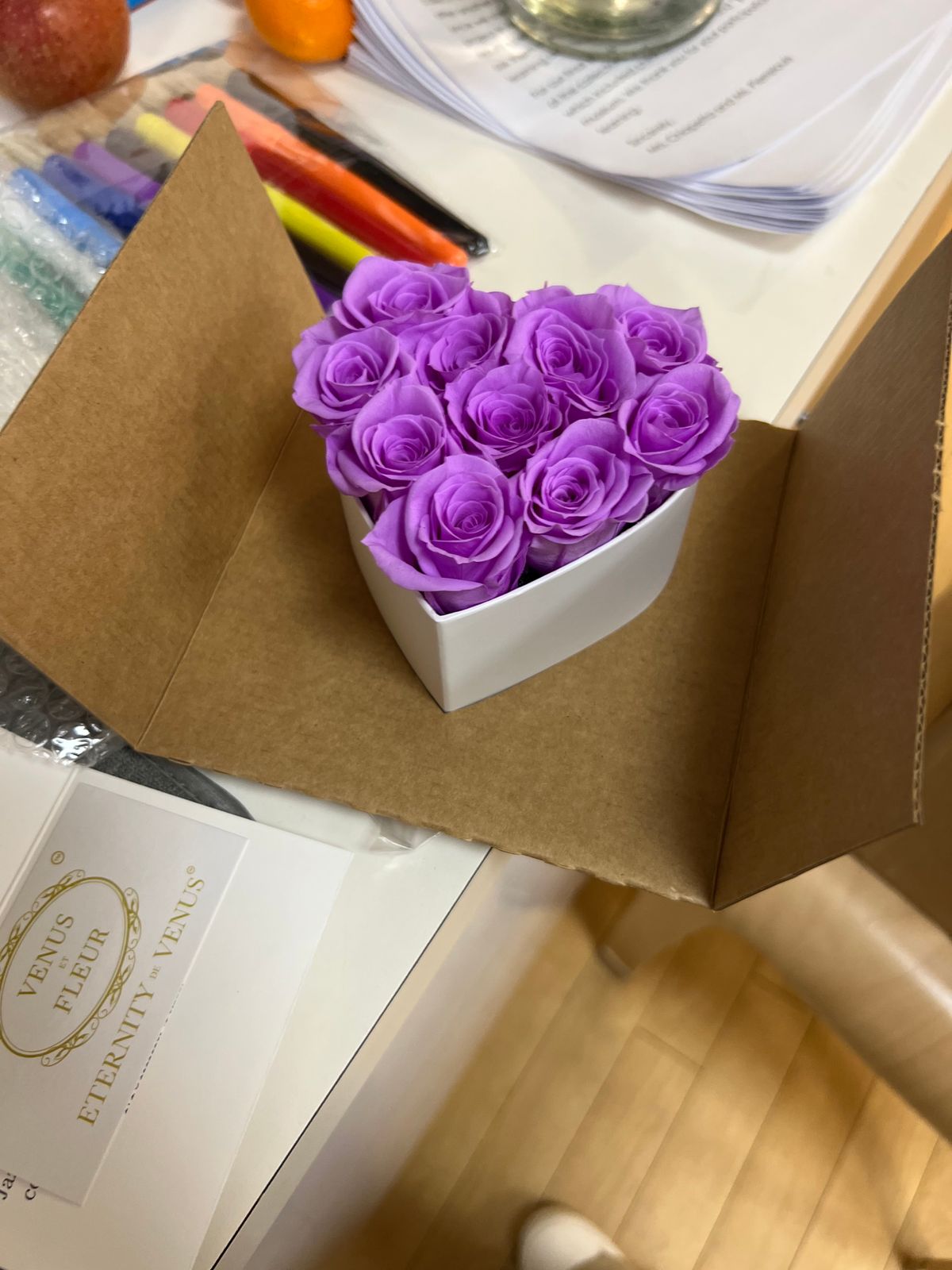 Delight the one you love with our new Le Petit Heart arrangement. This little luxury comes in a heart-shaped mini Parisian hat box in black or white, and it features 9-11 Petite Eternity® Roses. Personalize it when you choose from one of ten stunning colors.