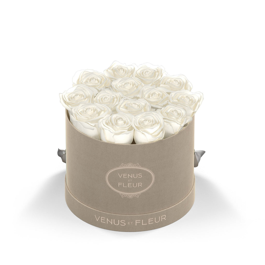 Our timeless Small Round arrangements are comprised of 13-15 exquisite Eternity Roses set in Parisian hat box-inspired vases. The classic arrangements will elevate any space with grace and simplicity.