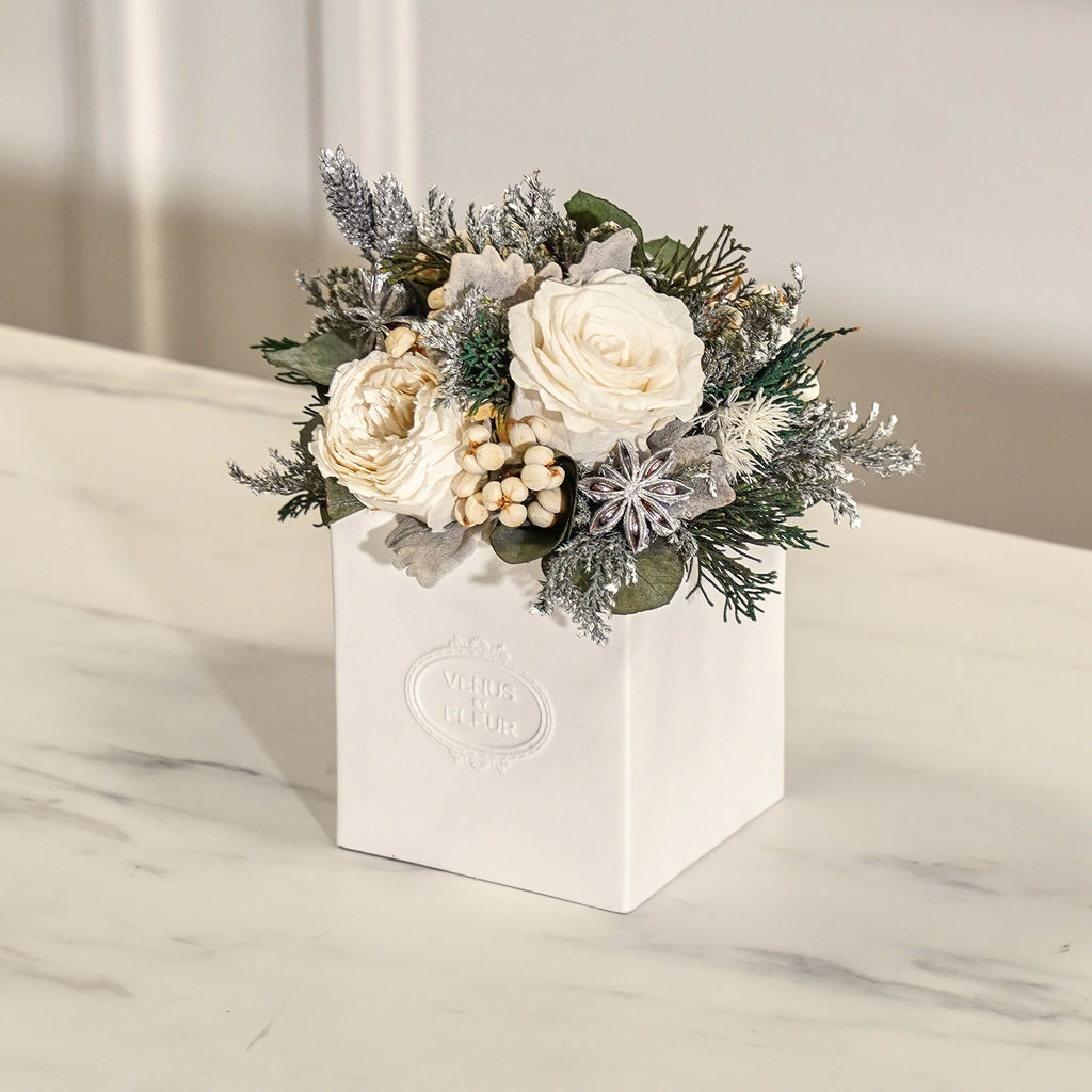 Includes our Eternity Blooms™– our signature roses, garden roses exclusive to Venus et Fleur from our partner farms in Japan, cyprus, eucalyptus greens, touches of metallic star anise, and asparagus fern in silver to create a winter wonderland. Featured in our signature porcelain vase.