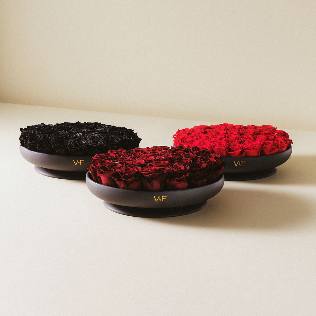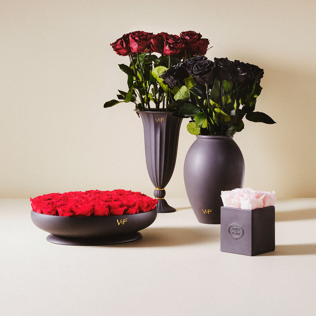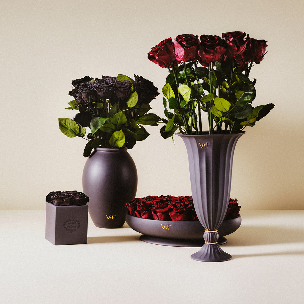 The opulence of this arrangement is balanced by the understated low profile of the porcelain oval Tazza vase, making this piece an ideal centerpiece for a dining or coffee table. Our black porcelain is fully pigmented, not just painted, giving the vase a unique depth of color that complements the deep, evening-ready palate of rose options. The vase is finished with a gold logo detail that nicely offsets the richness of the charcoal vessel.