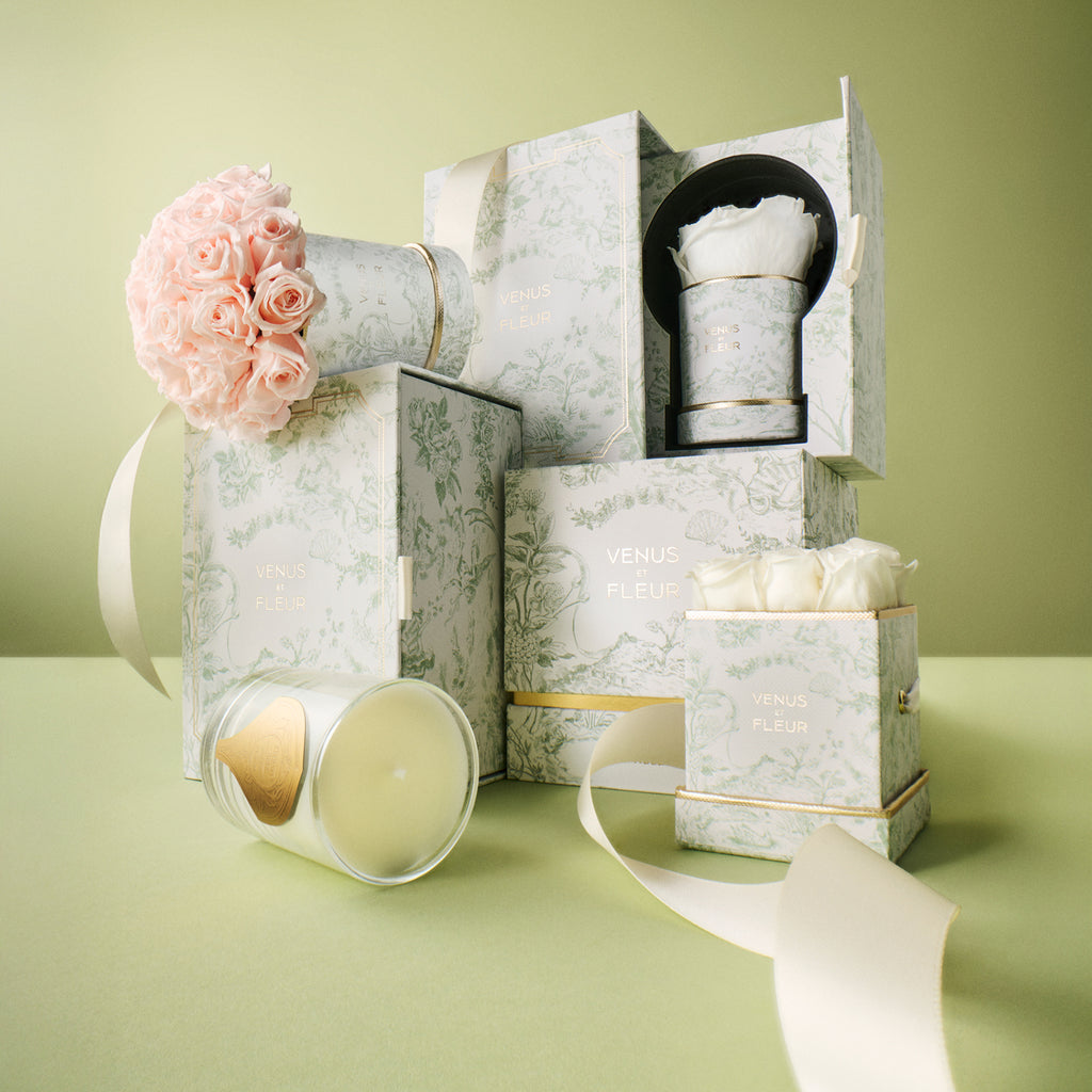 Presented in an exclusive toile-print box adorned with gold accents and a hand-drawn illustration inspired by the goddess Venus, this elegant keepsake embodies strength, grace, and devotion. Each piece is thoughtfully crafted and beautifully arranged, offering a timeless expression of love and appreciation.